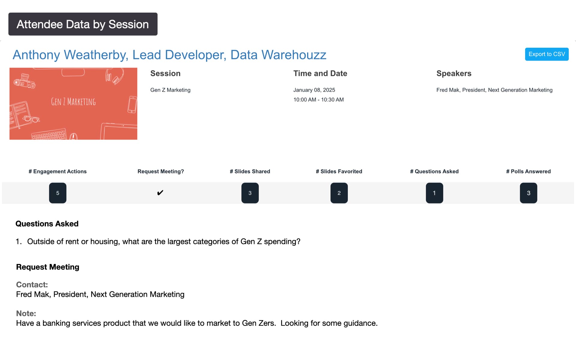 - Capture meeting requests, questions, poll answers, and impact of social shares across sessions.